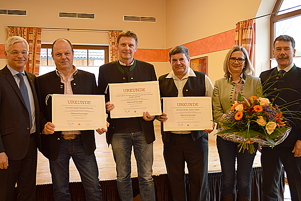 Mit der Silbernen Ehrennadel des bayerischen Zimmererverbandes ehrten Präsident Peter Aicher (l.) und Bezirksvorsitzender Anton Bammer (r.): (ab 2. v. l.) Richard Stanzel, Josef Lechner und Johann Mack. Blumen erhielt Susanne Stanzel.