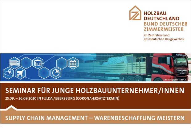 Holzbau Deutschland bietet ein Seminar für junge Holzbauunternehmer/-innen an und zwar von 25. bis 26. September 2020 in Fulda/Ebersburg in der Rhön. Der Schwerpunkttitel heißt "Supply Chain Management - Warenbeschaffung meistern". Die Anmeldung ist bereits möglich.